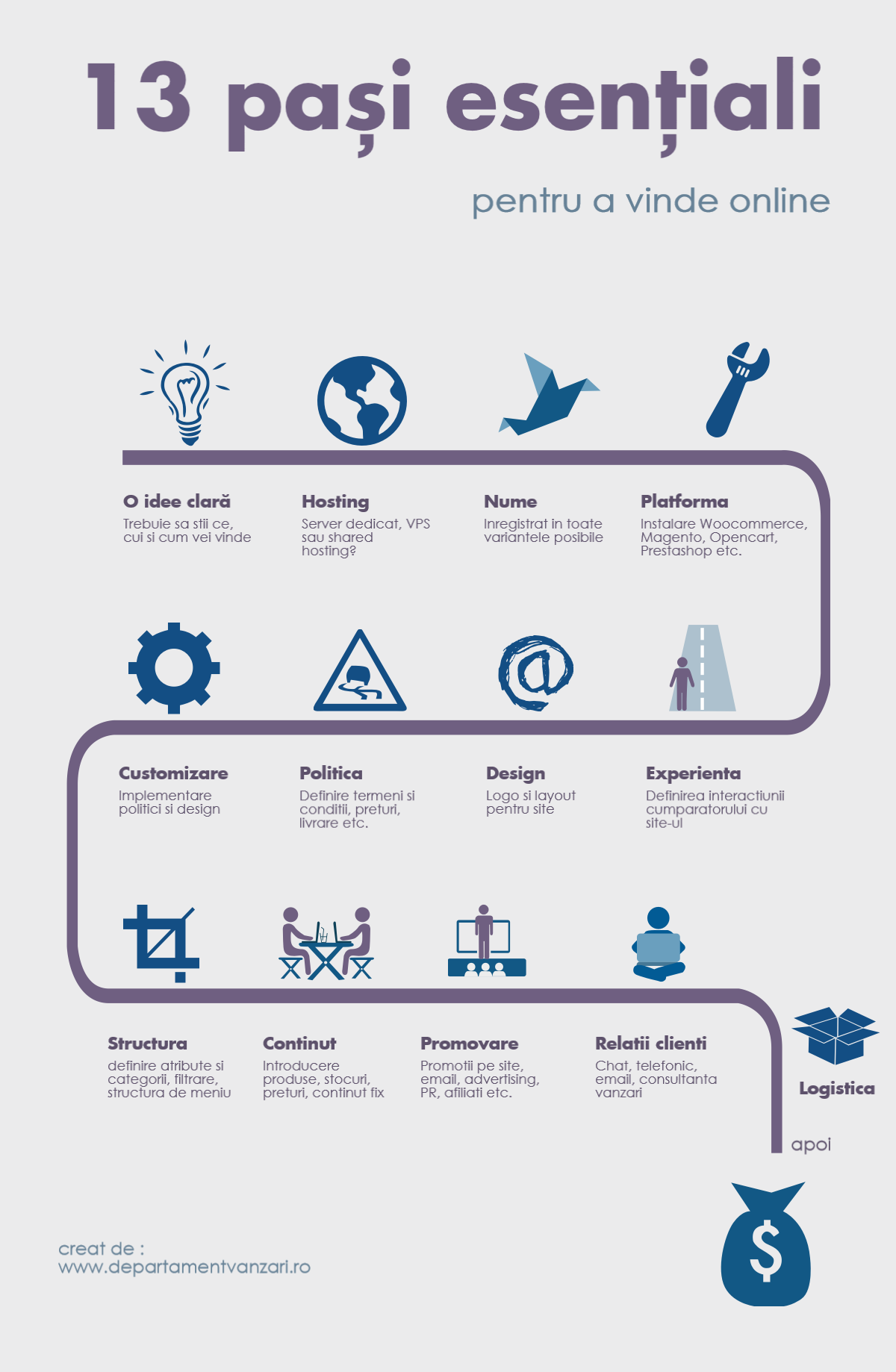 1. Cel mai rapid: pui produsele pe o platformă online existentă. Cei mai mulți din pașii de mai sus sunt deja implementați, pui produsele pe site, fotografii și descrieri și poți să vinzi imediat. Deși pare metoda perfectă, are câteva dezavantaje: pierzi personalitatea prezentării și conceptului de vânzare, nu ai controlul lanțului de distribuție si nu te poți promova personalizat. Este eficient pentru produse care sunt deja lider de piață, însă va fi extrem de dificil să deschizi așa piețe noi sau să testezi idei noi. De asemenea, valoarea brandurilor tale poate să devină dependentă de calitatea magazinelor online unde se vând.